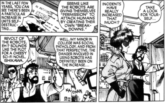 A final variant on the “secondary source” is to ironically deflate a concept by presenting it as already SFnal from the point of view of the characters, like this exchange from my 9th grade obsession, the Ghost in the Shell manga: